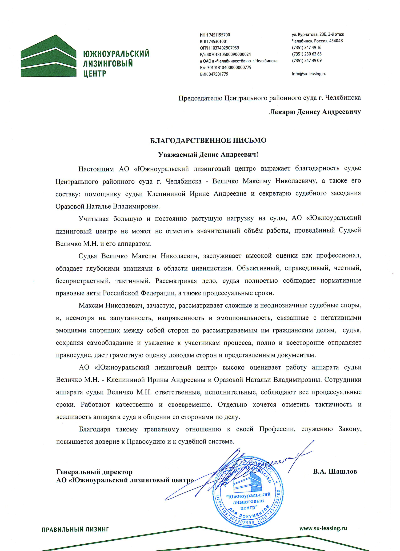 Благодарственное письмо судье Центрального районного суда г. Челябинска и аппарату суда